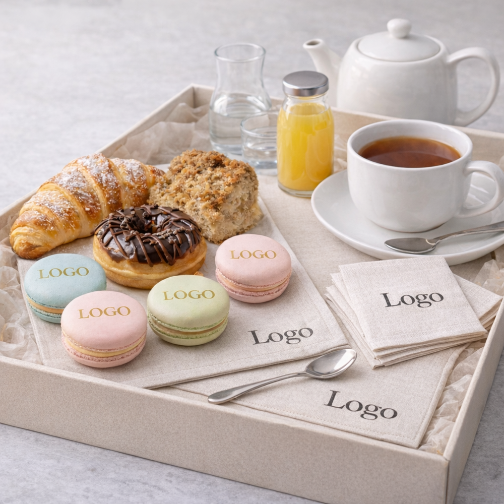 Colazione in elegante box con tovaglioli, tovaglietta e macarons personalizzati. Un’esperienza curata nei minimi dettagli, dove estetica e gusto si incontrano per creare un coffee break esclusivo.