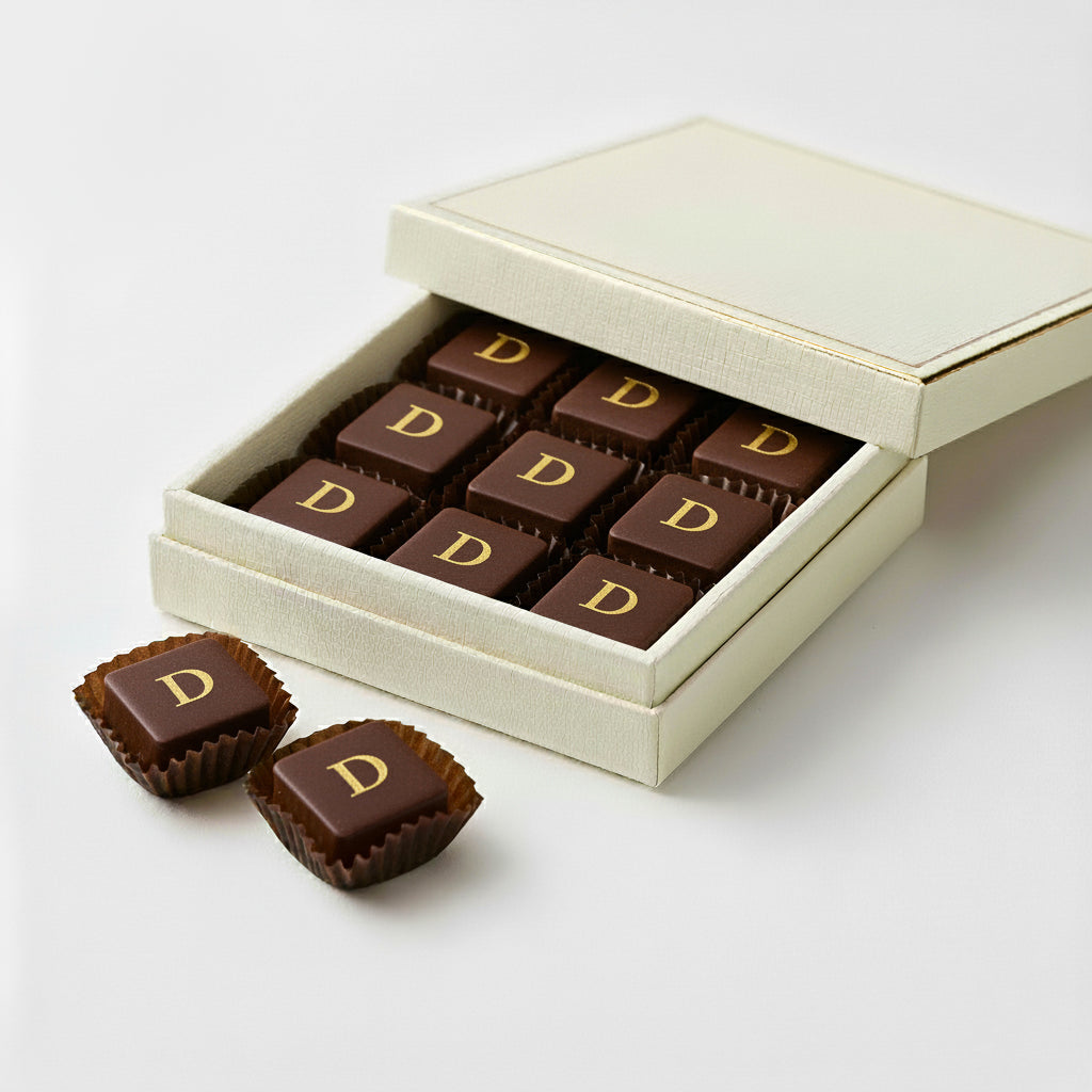 Le praline possono essere personalizzate con il logo aziendale o le iniziali del brand, tramite incisione o stampa alimentare di alta qualità.